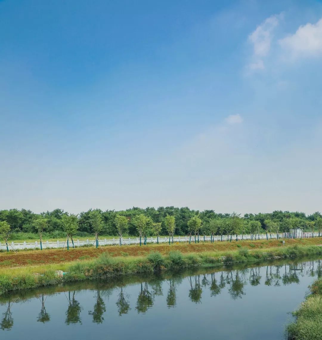 兩岸碧綠的草地和青翠的樹(shù)木相依相偎