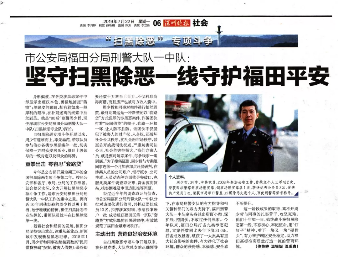 這一階段成果的取得,離不開周少哲與同事的扎實苦干、攻堅克難。他們十年如一日,始終戰(zhàn)斗在掃黑除惡第一線,不忘初心、牢記使命,用“釘釘子”精神,啃下一塊又一塊“硬骨頭”,有力維護轄區(qū)安全穩(wěn)定,助力福田高標準高質(zhì)量打造一流的營商環(huán)境。