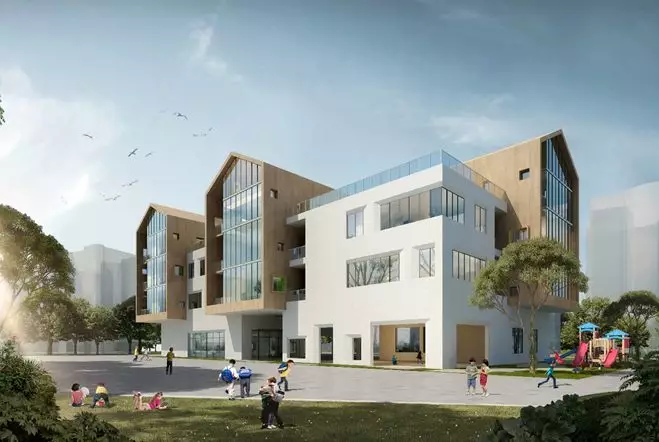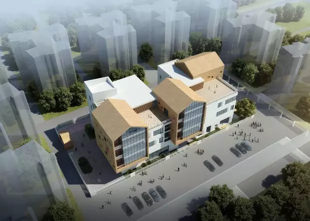 建筑造型簡潔現(xiàn)代,在白色體量上嵌入三個(gè)木色坡屋頂體塊,如積木城堡一般,富有童趣,建筑設(shè)有集中活動(dòng)平臺作為補(bǔ)充。