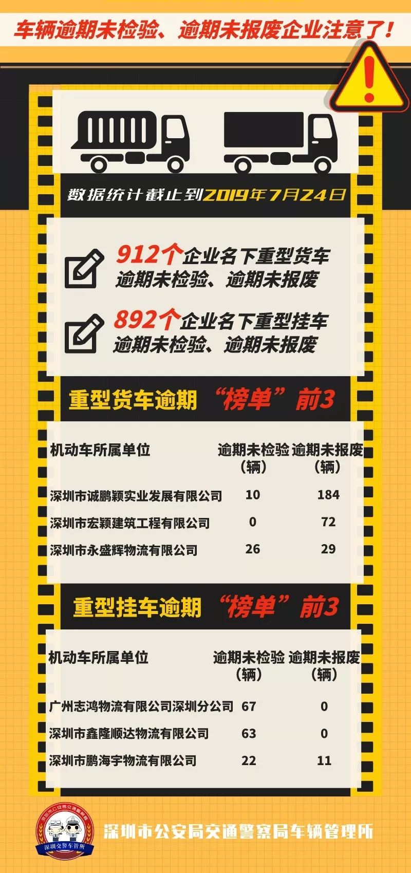 見圳客戶端·深圳新聞網(wǎng)2019年7月26日訊(見圳客戶端 深圳新聞網(wǎng)記者 何暢)車輛逾期未檢驗(yàn)、逾期未報(bào)廢,存在著重大交通安全隱患,深圳部分企業(yè)不重視安全管理、名下有大量“問題車輛”未處理。7月26日“深圳交警權(quán)威發(fā)布”微信公眾號(hào)就對(duì)相關(guān)企業(yè)進(jìn)行了點(diǎn)名曝光。