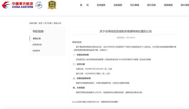 繼深航之后,東航也剛剛發(fā)布了關(guān)于臺灣地區(qū)航線相關(guān)客票特殊處置的公告:涉及購買東航臺灣地區(qū)航線客票(東航實際承運(yùn)及*MU代碼共享的781客票)的自由行旅客,出票日期在2019年7月31日24:00(含)之前,旅行日期在2019年8月1日零時(含)之后的,旅客可在客票有效期內(nèi),申請辦理退票手續(xù),無須支付退票手續(xù)費(fèi)。