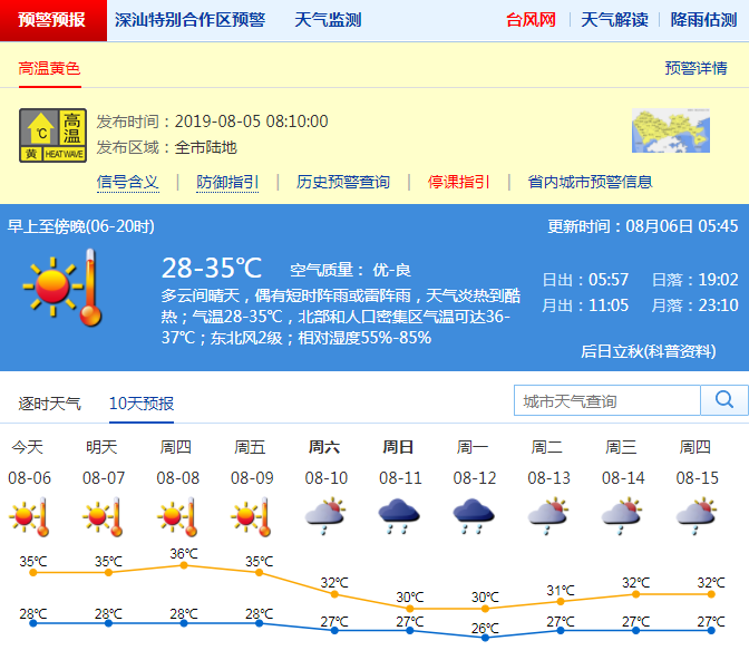 最新的氣象預(yù)報(bào)顯示,未來4-5天,深圳持續(xù)高溫天氣。8月6-9日受副熱帶高壓和臺(tái)風(fēng)“利奇馬”偏北下沉氣流的影響,深圳市以晴天為主,高溫天氣持續(xù),大部分地區(qū)最高氣溫34-36度,中北部和人口密集區(qū)可達(dá)37度或以上;10-11日轉(zhuǎn)雷陣雨。