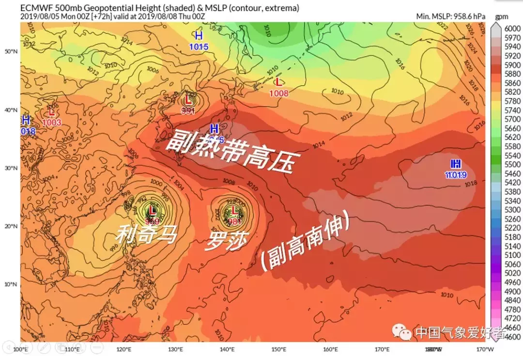 羅莎臺(tái)風(fēng)將會(huì)是一個(gè)又大又強(qiáng)的臺(tái)風(fēng)。由于個(gè)頭太大,副高壓不住,所以它不會(huì)來(lái)我國(guó),最大可能是緩慢北上登陸日本。不過(guò),羅莎將會(huì)阻止副高在利奇馬南側(cè)西伸,并且對(duì)利奇馬有互斥作用,是利奇馬臺(tái)風(fēng)的“導(dǎo)演”之一??傮w看來(lái),羅莎將會(huì)對(duì)利奇馬施加向西的作用力,促使利奇馬更靠近我國(guó)。