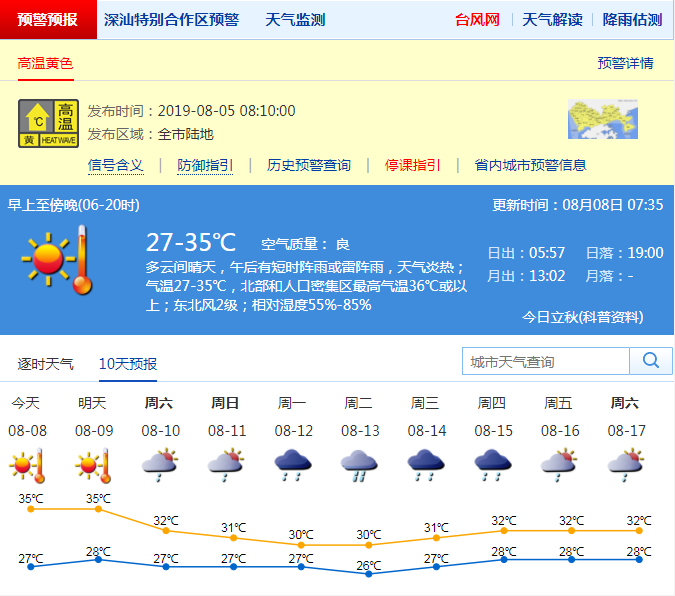 見圳客戶端·深圳新聞網(wǎng)2019年8月8日訊 隨著第9號(hào)臺(tái)風(fēng)“利奇馬”逐漸靠近,深圳逐漸受其外圍偏北下沉氣流影響,預(yù)計(jì)8-9日深圳市高溫加劇,晴天間多云,有輕微至輕度霾,氣溫28-35℃,北部和人口密集地區(qū)最高氣溫37℃以上,午后局地有熱雷雨,雨時(shí)伴有短時(shí)大風(fēng)。