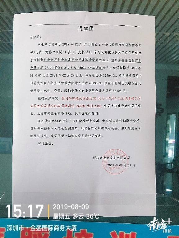 事實(shí)上,攸攸舞蹈學(xué)校清湖校區(qū)因“不定期停電影響正常上課”的情況自今年5月30日已出現(xiàn),當(dāng)時(shí)即有學(xué)員猜測是校方拖欠租金所致。而8月9日,舞蹈室門外出現(xiàn)了一份落款為深圳市金籃實(shí)業(yè)有限公司的通知函,上面顯示該校區(qū)已欠繳租金、管理費(fèi)、水電等費(fèi)用總計(jì)56408元。足見欠費(fèi)已持續(xù)一段時(shí)間。