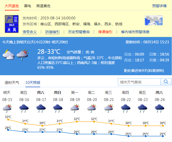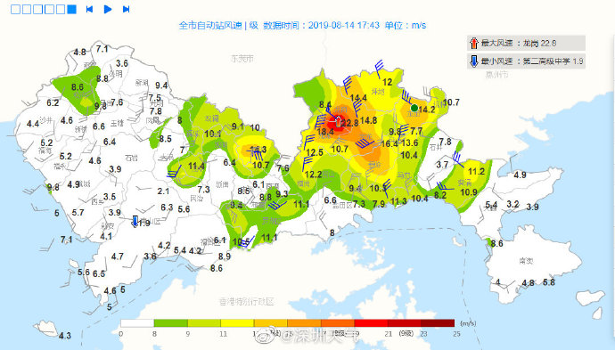 風(fēng)力逐漸減弱,深圳市氣象臺于2019年08月14日17時(shí)15分在南山區(qū),西部海區(qū)和寶安區(qū)(新安、福海、福永、西鄉(xiāng)、航城街道)取消大風(fēng)藍(lán)色預(yù)警。