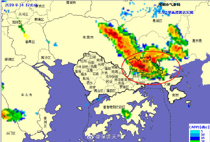 預(yù)計(jì)坪山區(qū)和龍崗區(qū)(坪地、寶龍、龍崗、龍城街道)1小時(shí)內(nèi)將出現(xiàn)30毫米左右降水,深圳市氣象臺于2019年08月14日17時(shí)05分在坪山區(qū)和龍崗區(qū)(坪地、寶龍、龍崗、龍城街道)發(fā)布暴雨黃色分區(qū)預(yù)警,全市進(jìn)入暴雨戒備狀態(tài),請注意防范。