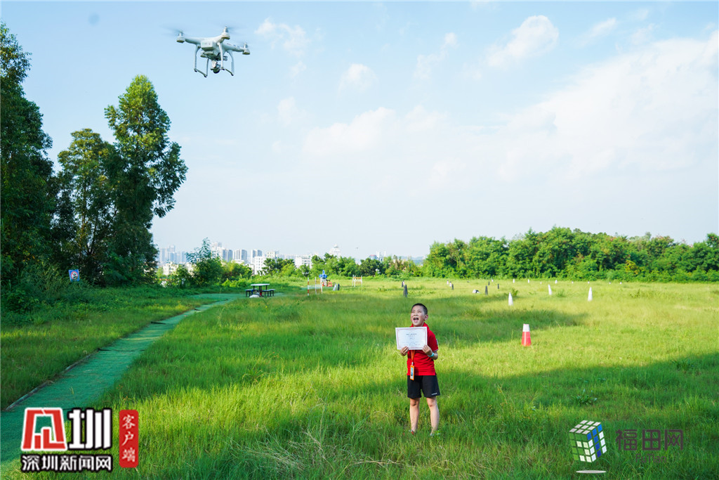 無人機(jī)飛行課程,小朋友在飛手的指導(dǎo)下學(xué)習(xí)操作無人機(jī)。