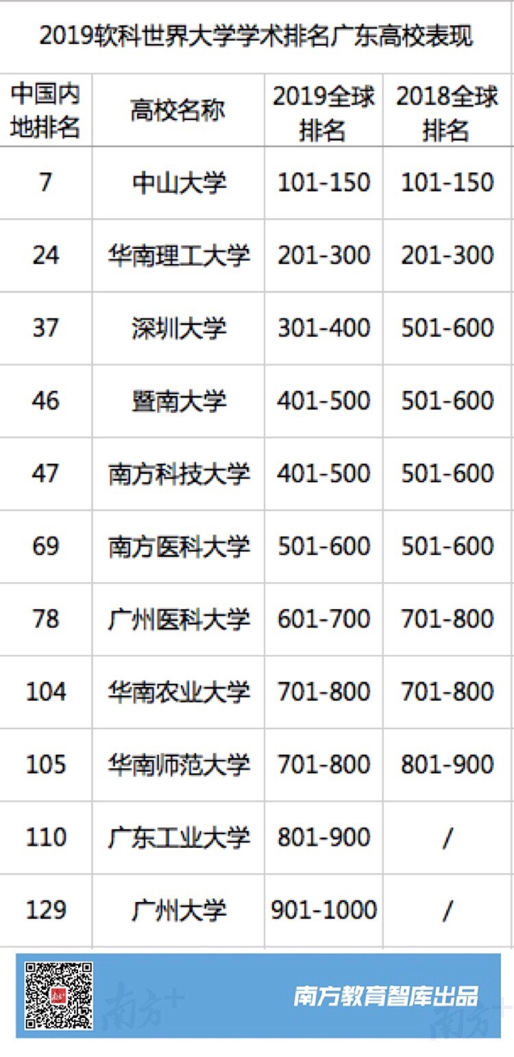 廣東高校共有11所上榜,上榜數(shù)量僅次于江蘇(20所)和北京(19所),排名第3。中山大學(xué)位居全球101-150位,中國內(nèi)地第7名;華南理工大學(xué)全球201-300位,位列中國內(nèi)地第24位。此次進步最大的是深圳大學(xué),從去年全球501-600位飆升至301-400位,全國排名第37名。進步的還有暨南大學(xué)和南方科技大學(xué),升至全球401-500位。