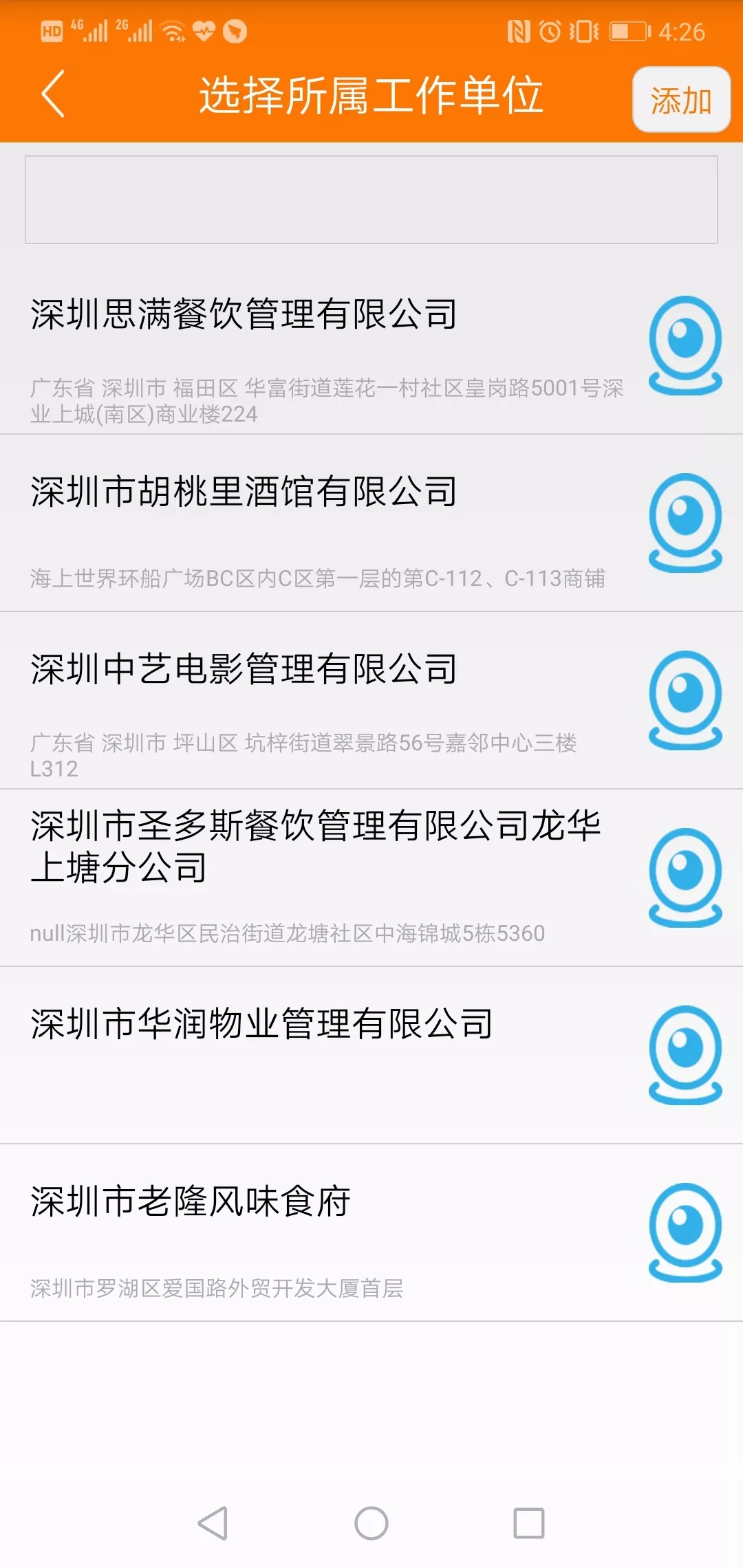 在選擇所屬單位時(shí),可以通過(guò)搜索“名稱關(guān)鍵詞”快速查詢,如果沒(méi)有你的餐廳或單位名字,可以點(diǎn)右上角的【添加】來(lái)添加。