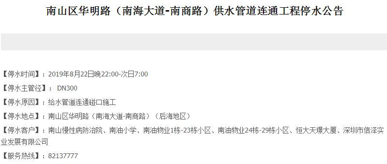停水客戶(hù):南山慢性病防治院、南油小學(xué)、南油物業(yè)1棟-23棟小區(qū)、南油物業(yè)24棟-29棟小區(qū)、恒大天璟大廈、深圳市信澤實(shí)業(yè)發(fā)展有限公司