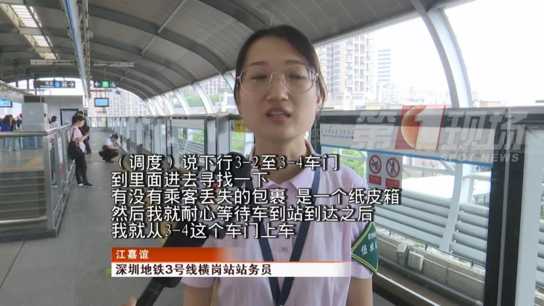當(dāng)時(shí),一輛列車即將到達(dá)龍崗的橫崗站,站務(wù)員從3-4號(hào)門上車尋找。最終,站務(wù)員在列車座位下面找到了乘客遺失的紙箱,