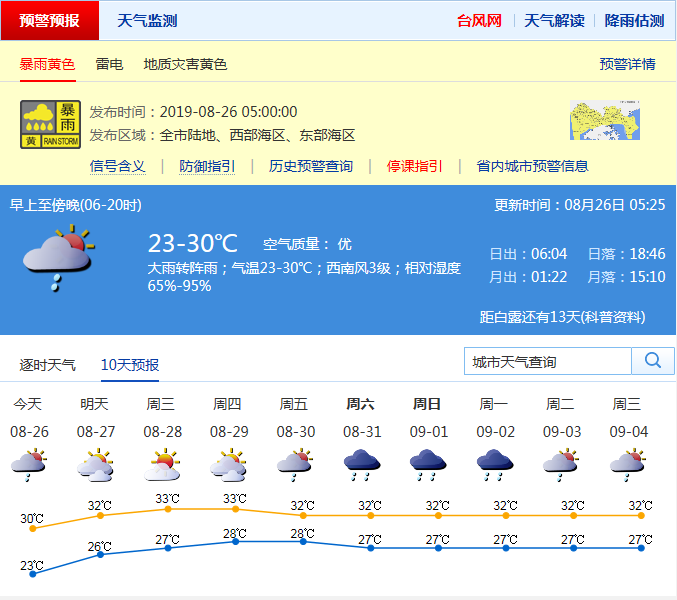 見圳客戶端·深圳新聞網(wǎng)2019年8月26日訊 今年第11號臺風(fēng)“白鹿”已經(jīng)于昨日7時(shí)25分在福建省東山縣沿海登陸后,已減弱為熱帶低壓,向西偏北方向移動,市氣象臺已于昨日17時(shí)取消臺風(fēng)白色預(yù)警信號。據(jù)市氣象局預(yù)計(jì),今日白天大雨轉(zhuǎn)陣雨,降雨減弱;27-29日多云間晴天,天氣趨于悶熱。