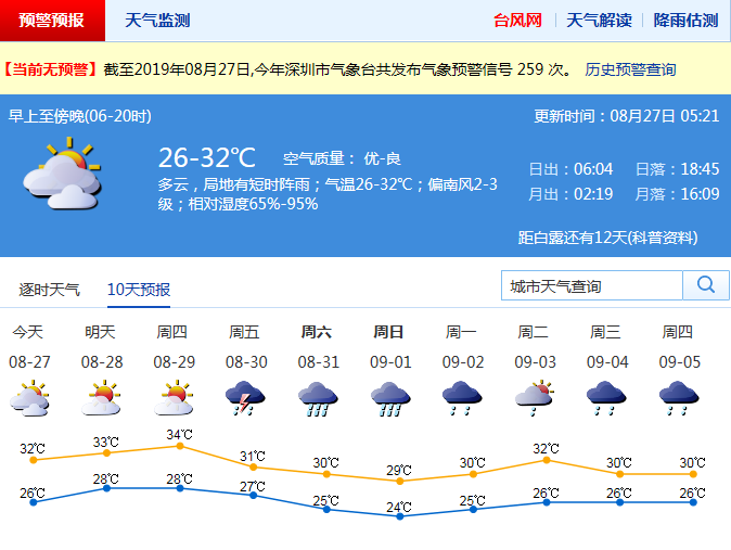 今天白天,全市陣雨轉多云天氣。最低氣溫26℃,最高氣溫32℃。市內維持2-3級偏南風。相對濕度65%-95%。