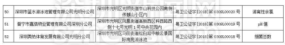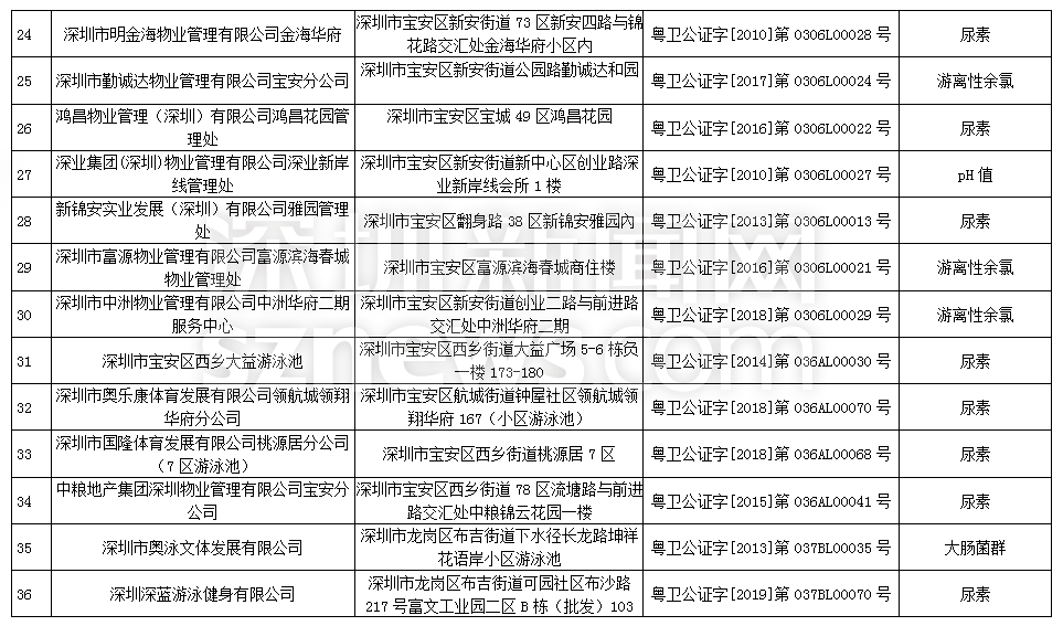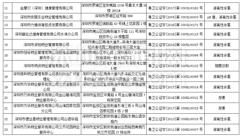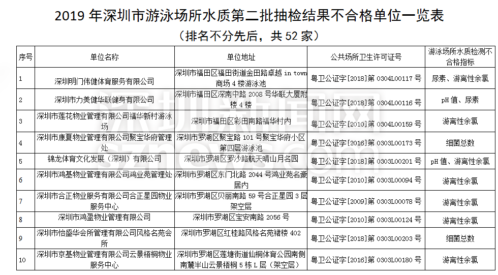 此次檢查結(jié)果顯示,深圳明門(mén)偉健體育服務(wù)有限公司(游泳池)、深圳市綠景物業(yè)管理有限公司城市立方花園管理處(游泳池)、深圳市盛世家物業(yè)管理有限公司花半里物業(yè)管理處(游泳池)尿素、游離性余氯兩項(xiàng)檢測(cè)指標(biāo)不合格,深圳市力美健華聯(lián)健身有限公司(游泳池)pH值、尿素兩項(xiàng)檢測(cè)指標(biāo)不合格,錦龍?bào)w育文化發(fā)展(深圳)有限公司(游泳池)、深圳市安居樂(lè)業(yè)物業(yè)管理有限公司(游泳池)、深圳市天健物業(yè)管理有限公司陽(yáng)光天健城管理處(游泳池)pH值、游離性余氯兩項(xiàng)檢測(cè)指標(biāo)不合格,此外,有45家游泳場(chǎng)所分別因pH值、尿素、游離性余氯、細(xì)菌總數(shù)以及大腸菌群等指標(biāo)不合格被予以通告。衛(wèi)生監(jiān)督部門(mén)已責(zé)令抽檢結(jié)果不合格單位立即整改。