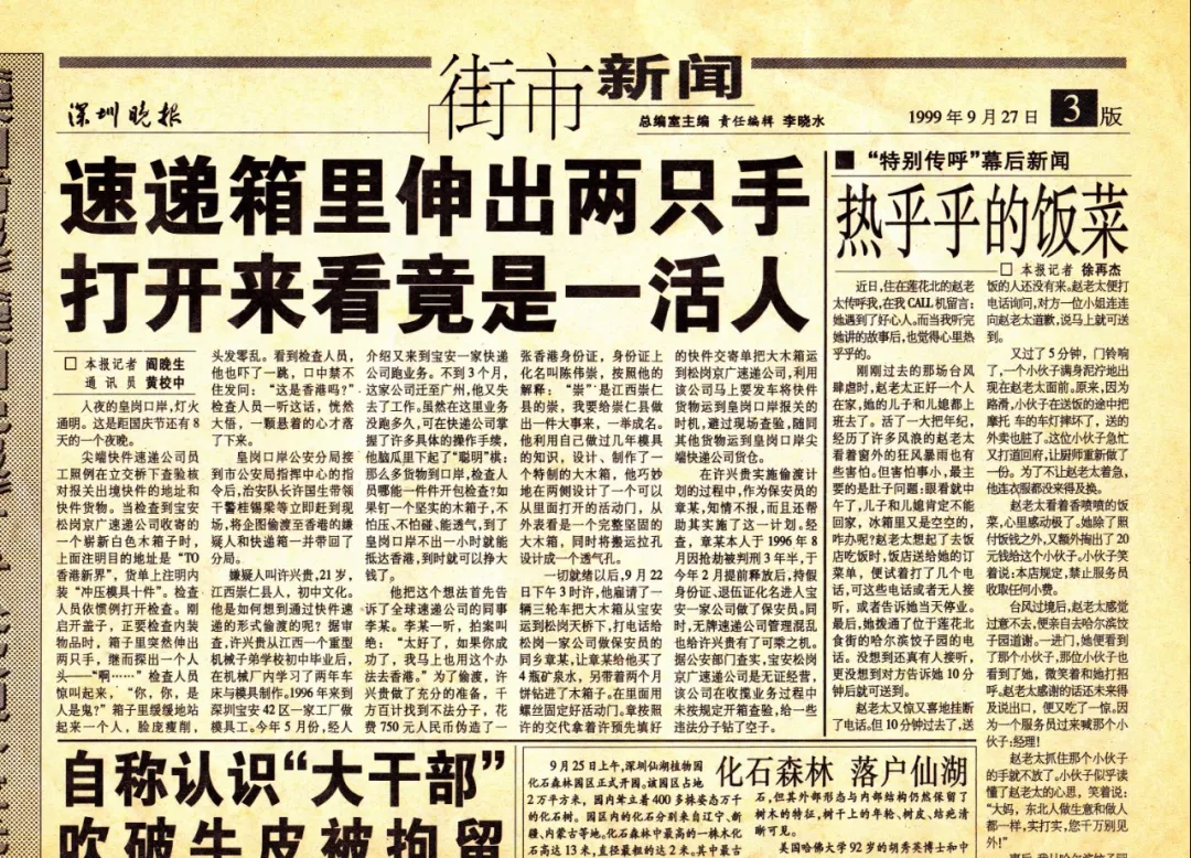 而歷史賦予這支鐵軍的特殊使命任務(wù)則是重拳打擊口岸走私和偷渡犯罪?;蕧徔诎杜沙鏊下毠す疱a梁至今還珍藏著一份些許泛黃的舊報紙,一篇名為“速遞箱里伸出兩只手,打開來看竟是一活人”的報道記錄了1999年9月22日曾發(fā)生的一起偷渡案件。作為當時參與處置的一員,桂錫梁回憶道,犯罪分子將自己裝進一個特制的大木箱中,偽裝成裝有“沖壓模具”發(fā)往香港的快遞箱,計劃偷渡出境,最終在位于皇崗口岸附近的快遞轉(zhuǎn)運點被警方查獲。