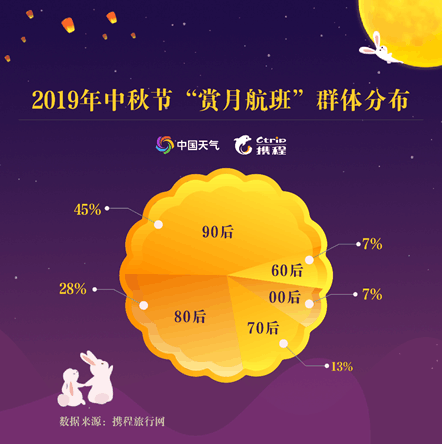 不僅如此,年齡結(jié)構(gòu)上,90后是空中追月人數(shù)最多的群體,占比為45%;其次是80后,占比達(dá)28%;70后和00后分列第三、第四位,占比分別為13%、7%。中秋當(dāng)晚(9月13日)、出發(fā)時間在18時至24時之間的航班通常被稱作“賞月航班”,機(jī)上乘客在飛行途中能近距離“接觸月亮”,感受“彩云追月”的新奇體驗。