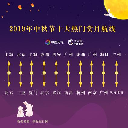 中秋節(jié)當(dāng)晚,應(yīng)去何處賞月?《報告》分析,杭州西湖、黃山宏村、盧溝橋、南京秦淮河、廬山、開封清明上河園、武漢黃鶴樓、廈門鼓浪嶼、鳳凰古城、敦煌月牙泉是今年中秋節(jié)十大最受歡迎賞月地。從天氣情況來看,中秋夜,鳳凰古城、黃鶴樓、南京秦淮河、敦煌月牙泉、廬山、宏村都可以欣賞到皓月當(dāng)空的美景;鼓浪嶼、西湖等景區(qū),可能出現(xiàn)彩云追月;清明上河園、盧溝橋等景區(qū),有較大幾率看到明月,另有一番情趣。據(jù)中國天氣網(wǎng)首席氣象分析師胡嘯介紹,這幾個最佳賞月地中,南京秦淮河最早可以賞月,18時03分當(dāng)?shù)卦缕?,黃鶴樓(18時20分)、鳳凰古城(18時36分)也將陸續(xù)看到圓月,最晚的是敦煌月牙泉,需等到19時51分,月亮才會慢慢升起。