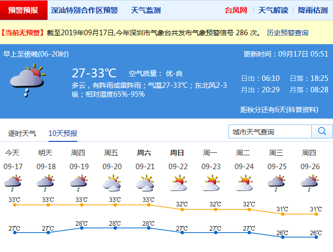 見圳客戶端·深圳新聞網(wǎng)2019年9月17日訊 記者從市氣象局了解到,深圳17日多云有陣雨或雷陣雨;氣溫27-33℃;東北風(fēng)2-3級(jí);相對(duì)濕度65%-95%。18-19日晴天間多云,天氣悶熱,午后局地有短時(shí)陣雨;20-23日晴熱干燥。