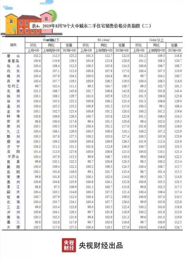 央視財(cái)經(jīng)2019年9月18日訊 近日,國(guó)家統(tǒng)計(jì)局發(fā)布了8月份70個(gè)大中城市商品住宅銷(xiāo)售價(jià)格變動(dòng)情況:一二線城市新建商品住宅和二手住宅銷(xiāo)售價(jià)格環(huán)比、同比漲幅均與上月相同或回落;三線城市新建商品住宅銷(xiāo)售價(jià)格環(huán)比漲幅與上月相同,二手住宅漲幅微升。