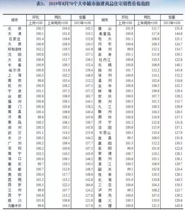 2019年8月份70個(gè)大中城市
