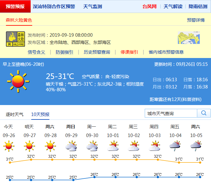 由于近期大氣層結(jié)靜穩(wěn),深圳持續(xù)受偏北下沉氣流控制,近地面風力微弱且中西部地區(qū)出現(xiàn)局地風向輻合,氣象條件不利于污染物擴散,25日下午中西部地區(qū)出現(xiàn)了輕微到輕度灰霾;預計入夜后,能見度將逐漸好轉(zhuǎn)。26-30日深圳晴天到多云為主,空氣干燥。26日氣溫25-31℃,陽光充足;展望10月初晴朗干燥天氣持續(xù)。森林火險預警持續(xù)生效中。