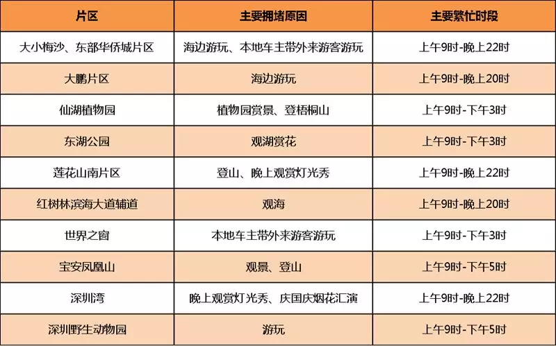 假日期間市內(nèi)交通每個(gè)時(shí)間段相對(duì)均衡,不會(huì)出現(xiàn)工作日的早晚高峰,車(chē)輛主要集中在市內(nèi)各景點(diǎn)和商圈周?chē)?,預(yù)計(jì)東部景區(qū)將會(huì)迎來(lái)巨大壓力,尤其是大小梅沙、東部華僑城、鹽壩高速葵涌出口。