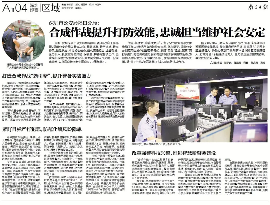 踐行新使命,忠誠(chéng)保大慶。為了全力做好各項(xiàng)安保維穩(wěn)工作,力爭(zhēng)把所有風(fēng)險(xiǎn)控在未發(fā)、化在萌芽,福田公安分局啟用合成作戰(zhàn)警務(wù)新模式,緊盯“云劍”追逃、禁毒“兩打兩控”,打擊傳統(tǒng)盜搶騙和電信詐騙以及“颶風(fēng)”行動(dòng)等專項(xiàng)行動(dòng),為刑偵、經(jīng)偵、治安、指揮等業(yè)務(wù)部門及各派出所服務(wù)支撐,提升打擊違法犯罪效能,形成應(yīng)對(duì)風(fēng)險(xiǎn)挑戰(zhàn)合力。