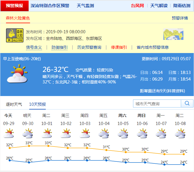 見圳客戶端·深圳新聞網2019年9月29日訊 今天9月29日深圳晴天間多云,天氣干燥,有輕微到輕度灰霾,氣溫26-32℃;東北風2-3級;相對濕度40%-90%。森林火險預警生效中,請繼續(xù)做好防火安全宣傳和管理工作。