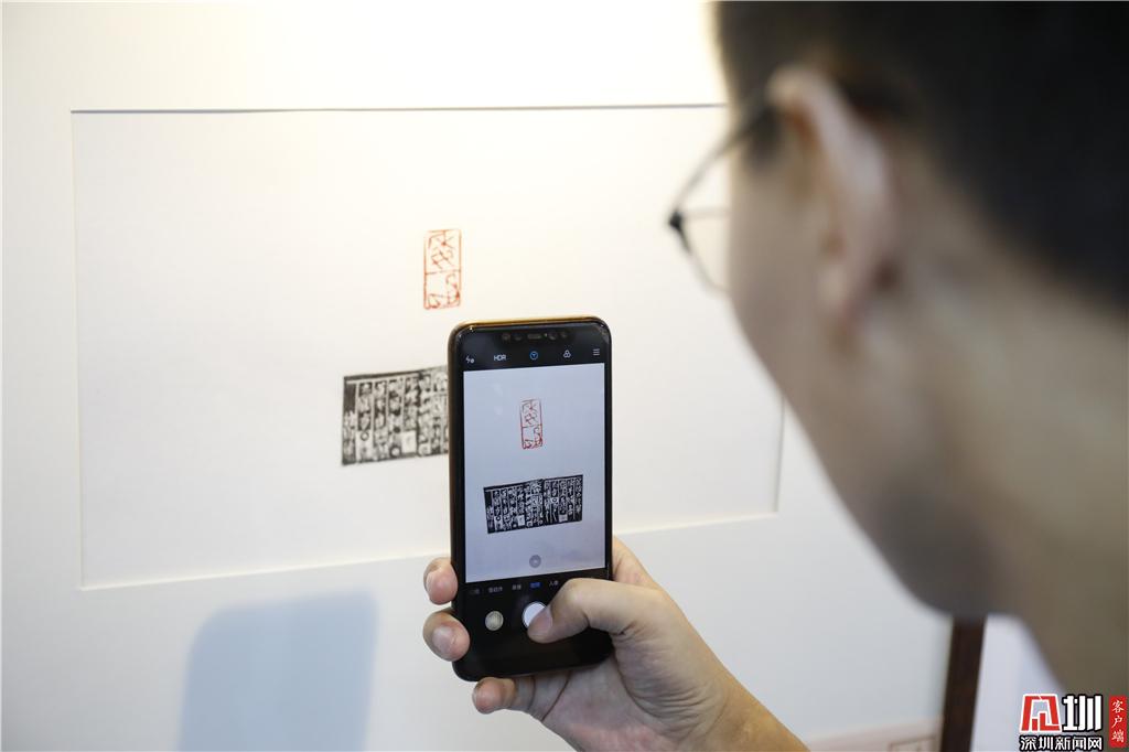 一位參觀(guān)者拿起手機(jī)拍下展覽作品