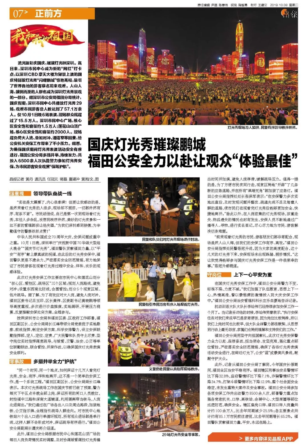 在國慶燈光秀安保工作中,福田公安分局警力不變,標準不降,力度不減?!拔覀兗訌娏岁犖榻逃枷肷舷乱恍?,熱情高漲,誓以最飽滿的激情投入到大慶安保工作中?!案L锕卜志种伟补芾砜瓶崎L左樂自豪地告訴記者。