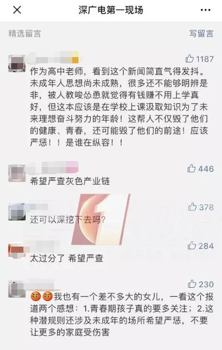 其中一位網(wǎng)友說(shuō):作為高中老師,看到這個(gè)新聞簡(jiǎn)直氣得發(fā)抖。未成年人思想尚未成熟,很多還不能夠明辨是非,被人教唆慫恿就覺(jué)得有錢賺不用上學(xué)真好,但這本應(yīng)該是在學(xué)校上課汲取知識(shí),為了未來(lái)理想奮斗努力的年齡!這幫人不僅毀了他們的健康、青春,還可能毀了他們的前途!應(yīng)該嚴(yán)懲,是誰(shuí)在縱容!