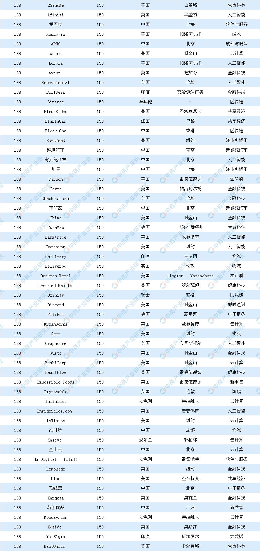 此外,全球獨角獸企業(yè)分布在25個行業(yè)里,電子商務和金融科技占全球獨角獸企業(yè)的31%,其次是云計算和人工智能。在電子商務行業(yè),共68家獨角獸企業(yè)上榜,其中來自中國的最多,有34家;其次是美國,17家;再次是德國,5家。金融科技行業(yè)則共56家獨角獸企業(yè)上榜,其中來自中國和美國的最多,分別有22家和21家;英國排名第三,有6家。(記者 謝惠茜)