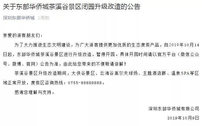 據(jù)深圳東部華僑城官方微博消息,自2019年10月14日起,東部華僑城茶溪谷景區(qū)進(jìn)行升級(jí)改造,暫停開園。