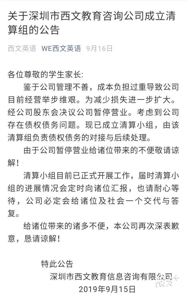 西文英語:公司已成立清算組負責學生學費善后事宜