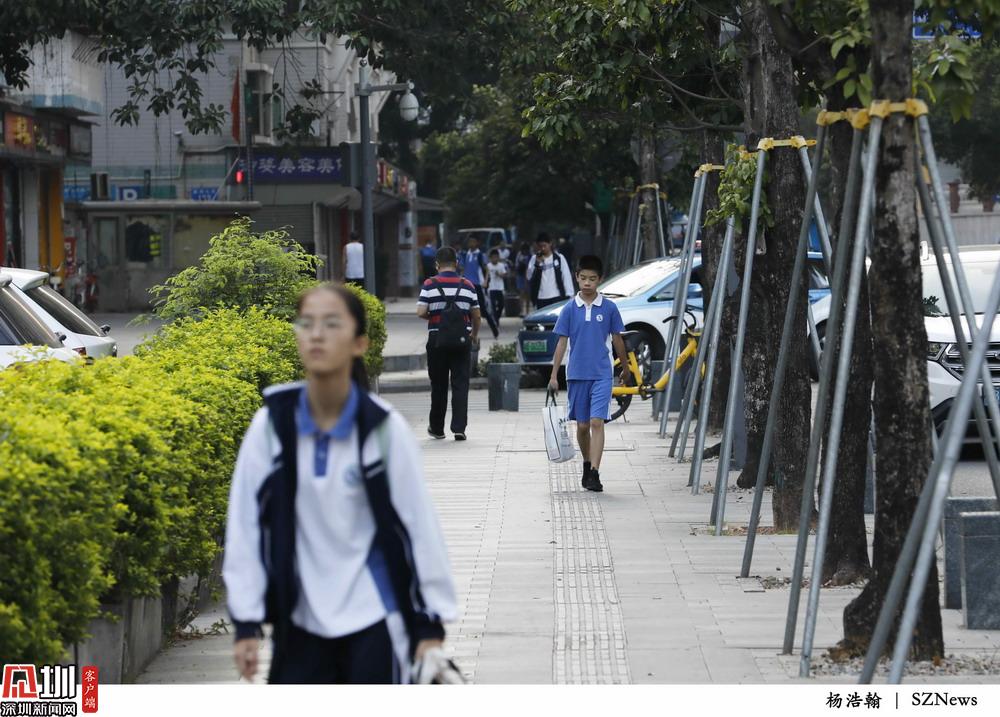 兩位分別穿夏裝和冬裝的學(xué)生。2019年10月24日,上學(xué)高峰期,福田新洲。