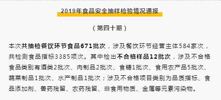 本次共抽檢生產(chǎn)、流通、餐飲環(huán)節(jié)食品975批次,涉及生產(chǎn)、流通、餐飲環(huán)節(jié)經(jīng)營主體616家次,共檢測食品指標5801項次。其中檢出不合格樣品10批次,涉及不合格食品類別有餐飲食品5批次,炒貨食品及堅果制品1批次,方便食品1批次,糕點1批次,肉制品1批次,食用油、油脂及其制品1批次;涉及不合格項目類別為獸藥殘留、品質(zhì)指標、微生物污染、食品添加劑。