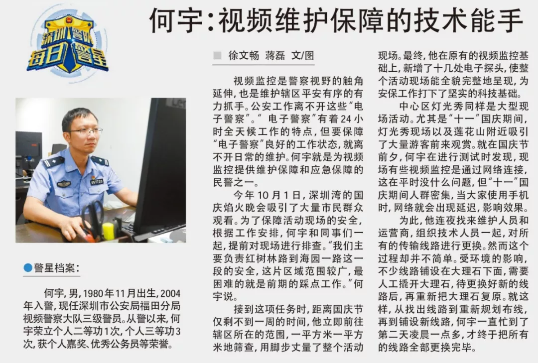 何宇,男,1980年11月出生,2004年入警,現(xiàn)任深圳市公安局福田分局視頻警察大隊三級警員。從警以來,何宇榮立個人二等功1次,個人三等功3次,獲個人嘉獎、優(yōu)秀公務(wù)員等榮譽。