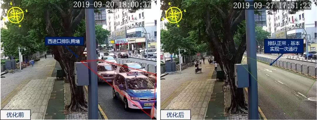 梅華/梅村路口位于梅林片區(qū),周邊商業(yè)住宅小區(qū)密集,早晚高峰通勤需求大。為保障行人過街安全,7月份以來,路口加裝了控右箭頭信號燈,同時為了解決人車交織問題,增加了行人專用相位,由于相位增多周期上升,相應(yīng)的右轉(zhuǎn)車輛通行效率會有所降低,導(dǎo)致高峰期出現(xiàn)東行排隊(duì)較長的情況。