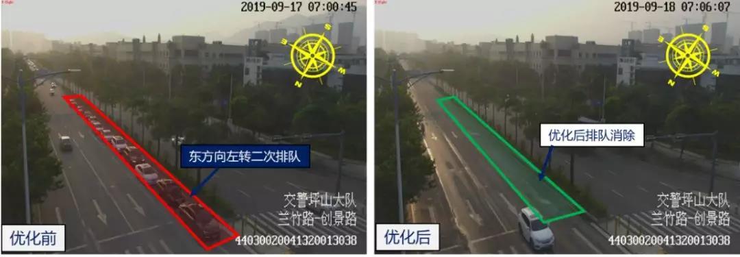 為解決該時段擁堵情況,交警優(yōu)化調(diào)整該路口早高峰時段紅綠燈,將早高峰時段由7時30分提前至6時50分,同時增加?xùn)|方向左轉(zhuǎn)綠燈時間20秒,以滿足車流通過需求。優(yōu)化后東方向左轉(zhuǎn)二次排隊情況消除,東方向左轉(zhuǎn)車通行量由原144pcu/h上升至196pcu/h,上升36.1%。