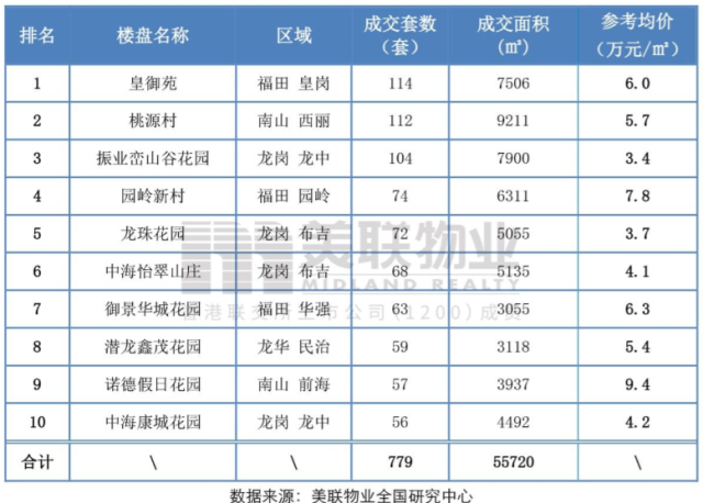 不過,與新房市場不同的是,二手住宅成交分布比較均勻。在第三季度二手住宅成交TOP10中,前三甲分別來自福田、南山和龍崗三區(qū)。其中,福田皇崗片區(qū)的皇御苑以114套的成交量位居榜首。