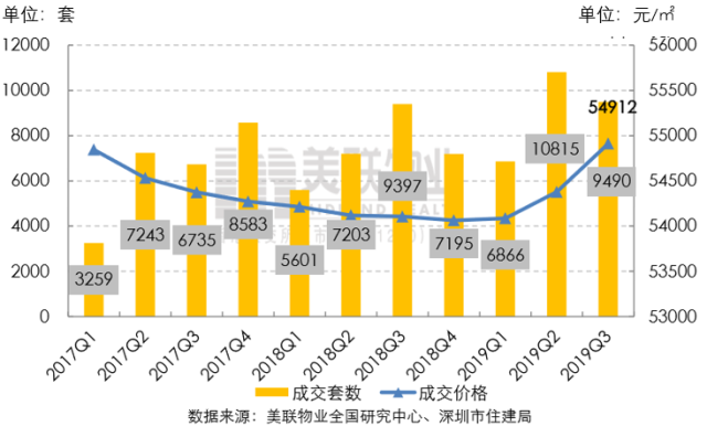 深圳市2017年以來一手住宅季度成交量價走勢圖