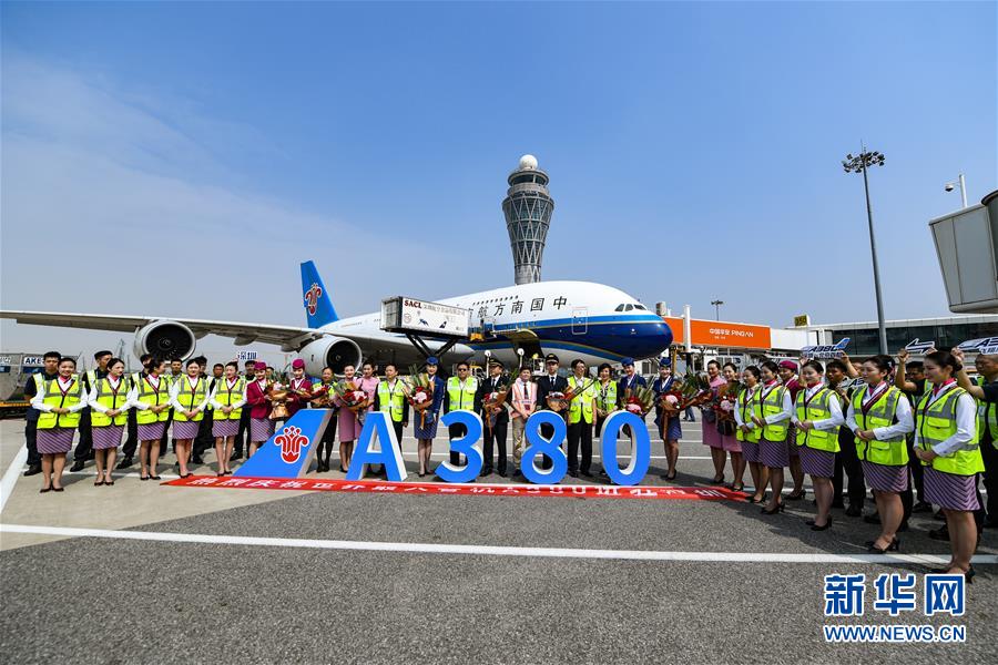 10月27日,機(jī)組、地勤人員等慶??罩锌蛙?chē)A380客機(jī)重返深圳機(jī)場(chǎng)。當(dāng)日下午,由全球最大寬體客機(jī)——空中客車(chē)A380執(zhí)飛的南航CZ3153次航班由深圳起飛前往北京,標(biāo)志著這款“空中巨無(wú)霸”機(jī)型重返深圳機(jī)場(chǎng)。南航曾在2014年5月開(kāi)始啟用A380執(zhí)飛京深航線(xiàn),后因動(dòng)態(tài)運(yùn)力調(diào)配停飛。新華社記者毛思倩攝