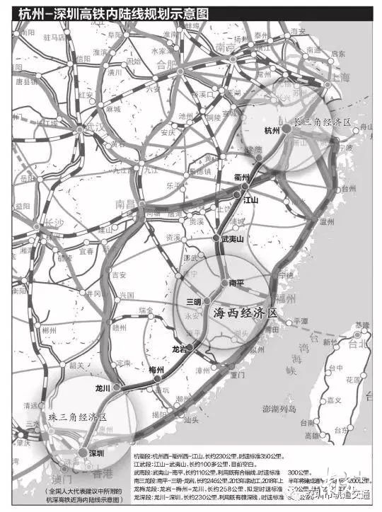 去年,參加全國(guó)兩會(huì)的部分全國(guó)人大代表提出一份《關(guān)于將杭深高鐵近海內(nèi)陸線列入國(guó)家“十三五”現(xiàn)代綜合交通發(fā)展規(guī)劃修編和國(guó)家中長(zhǎng)期鐵路網(wǎng)規(guī)劃的建議》。杭深高鐵近海內(nèi)陸線擬自杭州西經(jīng)衢州西-江山-武夷山-南平-三明-龍巖-梅州-龍川至深圳,總長(zhǎng)約1200公里。