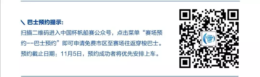 掃描二維碼進(jìn)入中國(guó)杯帆船賽公眾號(hào),點(diǎn)擊菜單“賽場(chǎng)預(yù)約-巴士預(yù)約”,即可申請(qǐng)免費(fèi)市區(qū)至賽場(chǎng)往返穿梭巴士。預(yù)約截止日期:11月5日,預(yù)約成功者將優(yōu)先安排上車。
