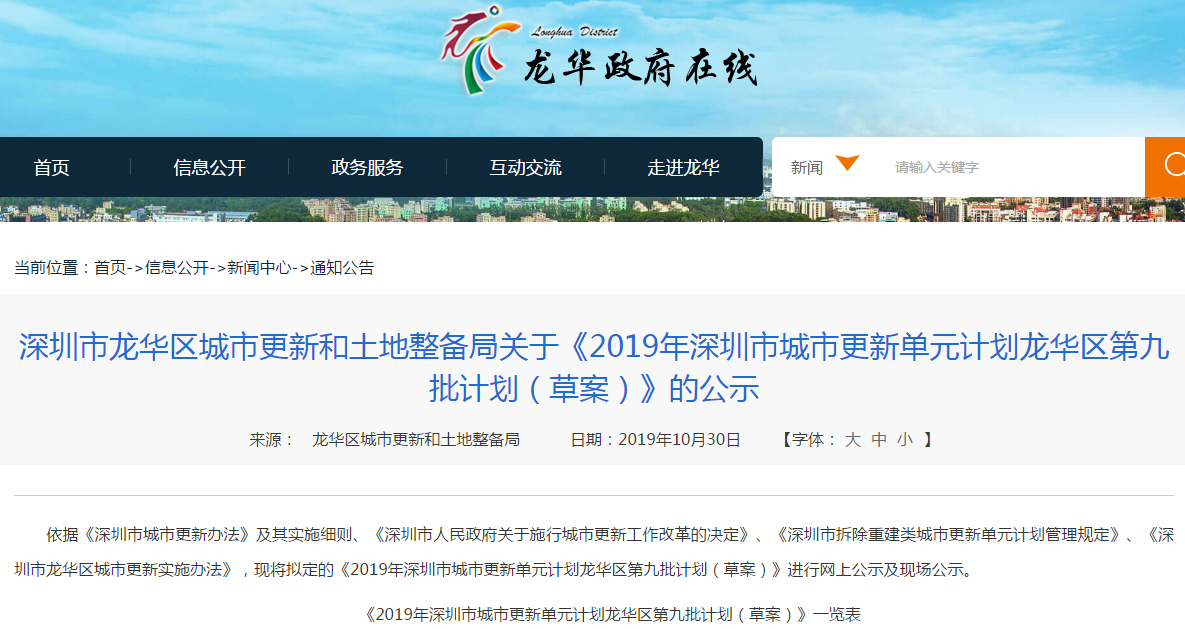 見圳客戶端·深圳新聞網(wǎng)2019年11月5日訊 10月30日,龍華區(qū)城市更新和土地整備局發(fā)布了《2019年深圳市城市更新單元計(jì)劃龍華區(qū)第九批計(jì)劃(草案)》的公示,更新地點(diǎn)分別在龍華街道、大浪街道,其中,龍華街道將建21600平方米高中用地一處,不少于9班幼兒園一所;大浪街道要落實(shí)用地面積不少于9132平方米的義務(wù)教育用地一處。