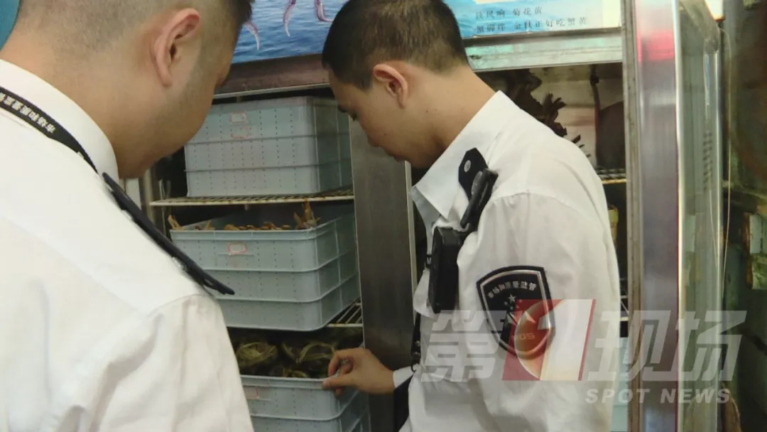執(zhí)法人員突擊檢查了羅芳水產(chǎn)批發(fā)市場內(nèi)幾間售賣膏蟹的商鋪,并沒有在店內(nèi)發(fā)現(xiàn)粗紅繩的蹤影,所有膏蟹以及大閘蟹所捆綁的繩子都是符合規(guī)格的,沒有吸水和壓秤的現(xiàn)象。