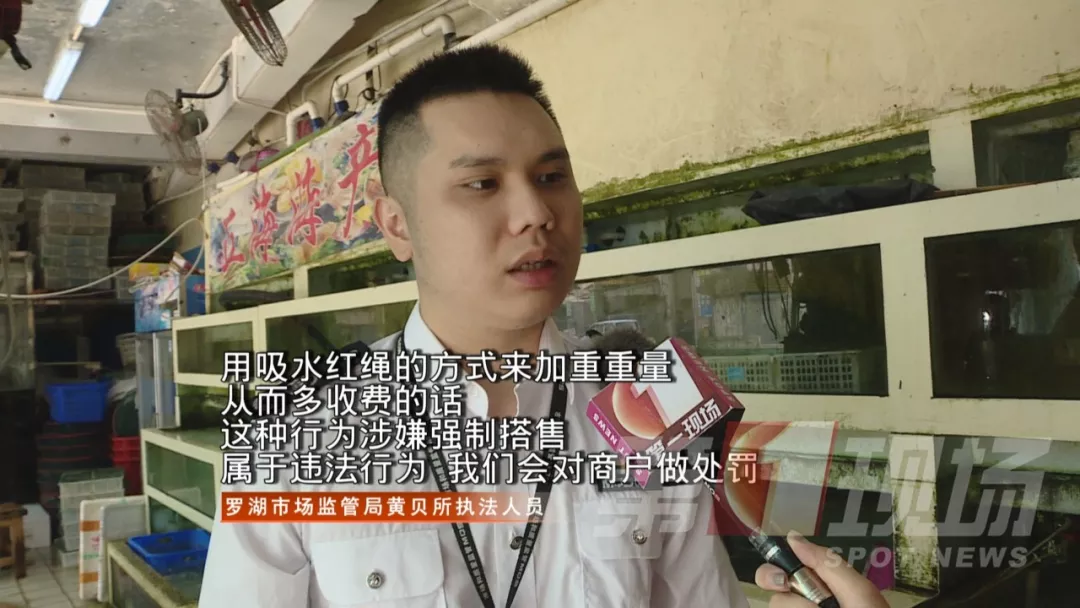 羅芳水產(chǎn)批發(fā)市場商家承認(rèn),的確有一些進貨商為了盈利,會要求他們幫忙把紅繩綁上去,或者自己將紅繩加上去的情況,那這一行為是否合規(guī)?記者聯(lián)系了轄區(qū)市場監(jiān)督管理局的執(zhí)法人員到現(xiàn)場。