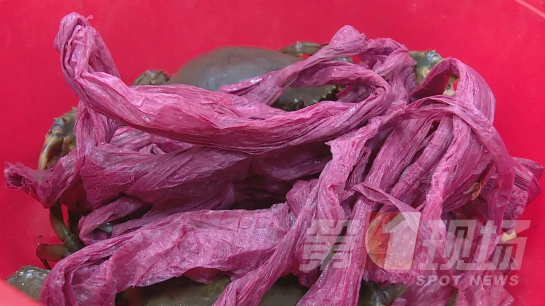 記者走訪另一家店鋪,同樣沒有發(fā)現(xiàn)綁粗紅繩的膏蟹。店家表示,水產(chǎn)市場里賣的膏蟹,是一筐筐從臺州運來直接批發(fā)售賣,運來時綁的都是白色塑料繩。