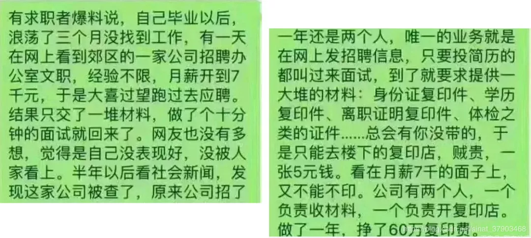 見圳客戶端·深圳新聞網(wǎng)2019年11月7日訊 有個帖子,最近廣為流傳,說是有騙子掛羊頭賣狗肉,打著公司招聘的幌子賺應(yīng)聘者的復(fù)印費(fèi),復(fù)印一張5塊錢,竟年入60萬!